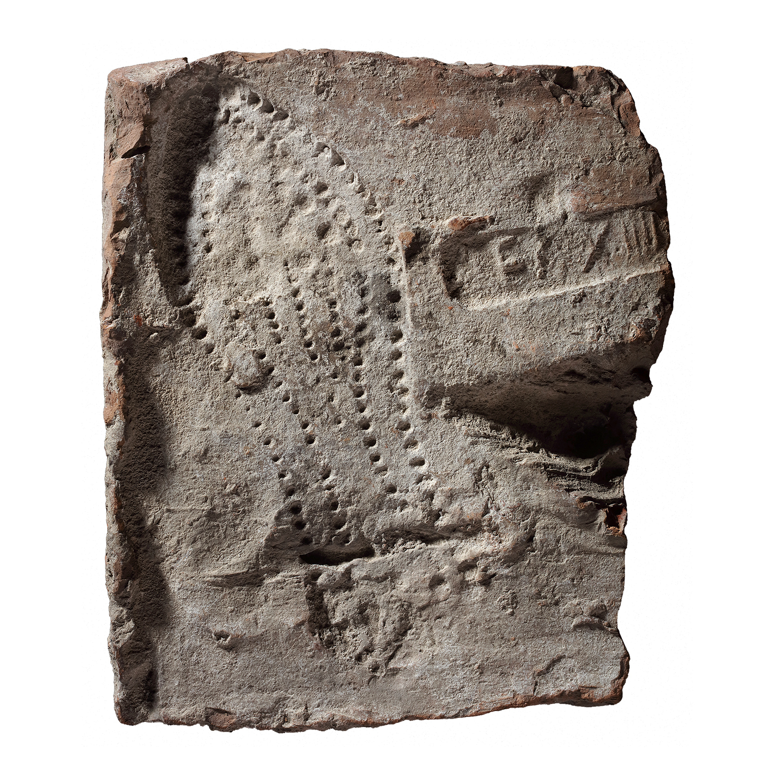 Fragmentierter Plattenziegel (later) mit Abdruck einer rechten, genagelten, spitz zulaufenden Schuhsohle, deren Länge 26,5 cm beträgt, sowie einem rechteckigen Stempel der Legio XIIII.