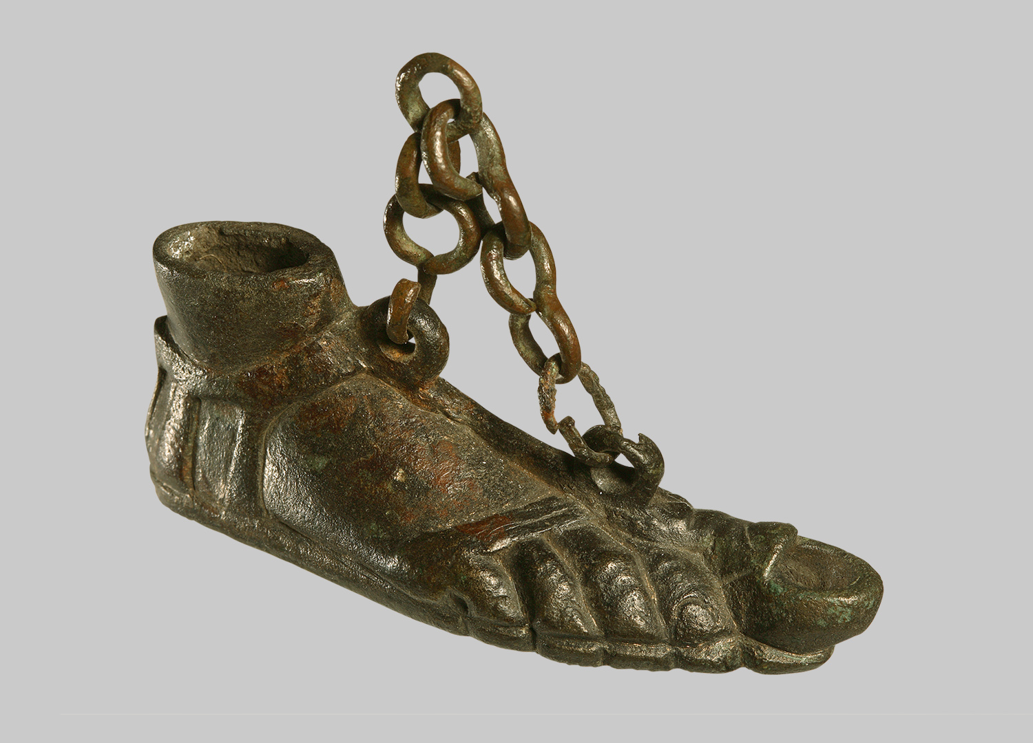 Körper in Form eines rechten, mit einer Sandale bekleideten Fußes. Der große Zehennagel diente als Dochtloch. Zwei Ösen mit eingehängtem kurzem Kettchen als Aufhängevorrichtung.