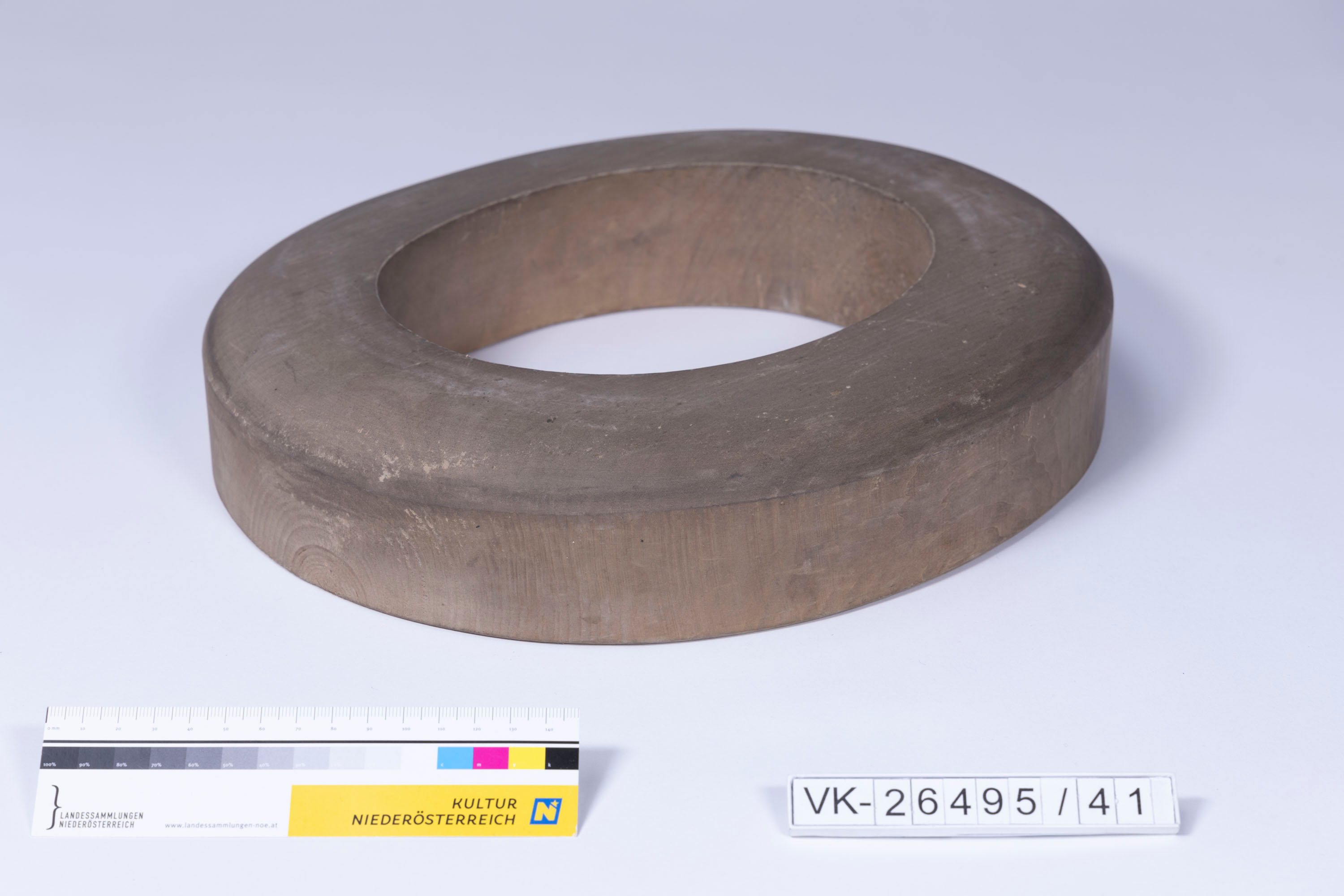 Holzform für eine Hutkrempe unlackiert, Model (positiv), vermutlich Teil einer mehrteiligen Hutform, gravierte Aufschrift "56" und Graphitbeschriftung: "6." auf der Unterseite