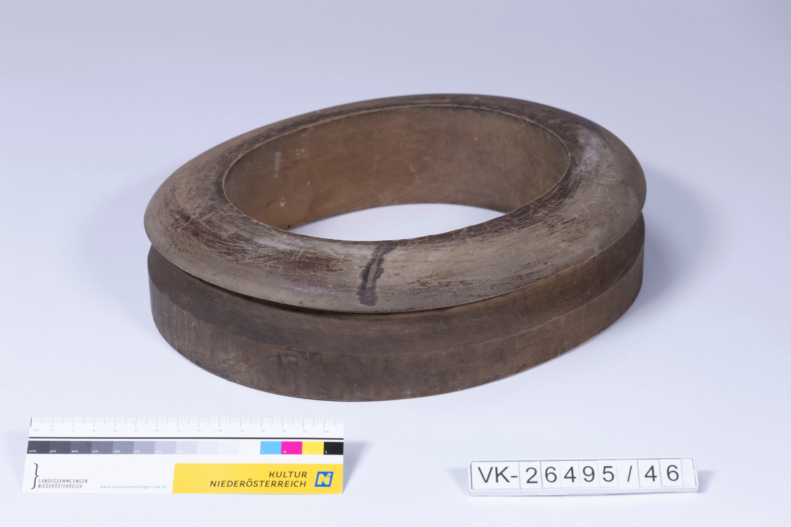 Holzform für eine Hutkrempe, Reste einer Lackierung, Model (positiv), vermutlich Teil einer mehrteiligen Hutform, gravierte Aufschrift "57"und Kugelschreiberbeschriftung:"H" auf der Unterseite