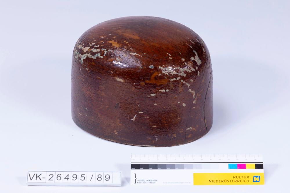 Holzform lackiert, Model (positiv) mit drei großen (2,7 cm und 3,2 cm) und zwei kleineren (1,9 cm) Löchern an der Unterseite zur Befestigung in einer Drehmaschine. Eingravierte Nummer "55" und Graphitmarkierung: "Kreuz" an der Unterseite.