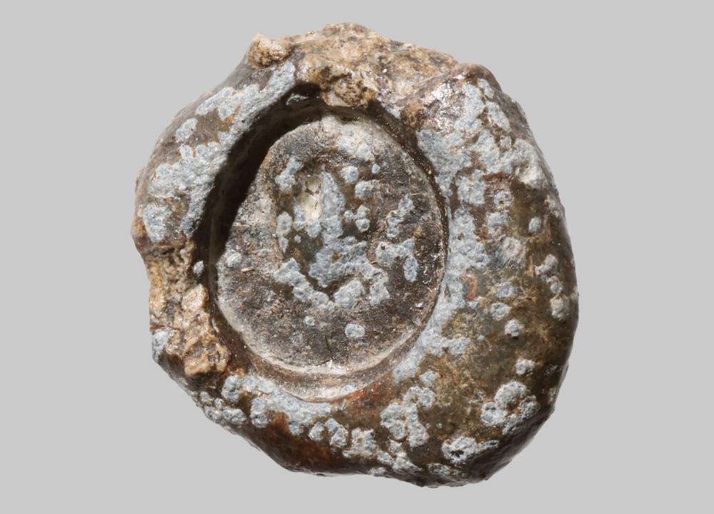 Plombe mit ovalem Stempel; ein männlicher Kopf im Profil; nach rechts blickend; bartlos; Gesichtszüge nicht mehr erkennbar; hinten senkrechte Durchlochung