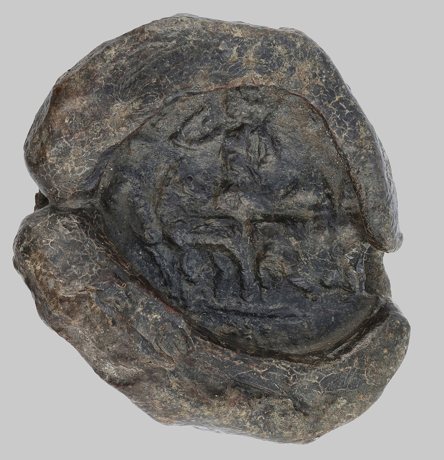 Plombe mit rundem Stempel; Rand über Darstellung überlappend; Sol in Frontansicht mit Quadriga, Kopf nach links blickend mit Strahlenkranz; in rechter Hand Peitsche, in linker Hand Palmzweig; Schriftzug in Kopfzeile teilweise lesbar; Buchstaben in Fußzeile NIN; hinten waagrechte Durchlochung