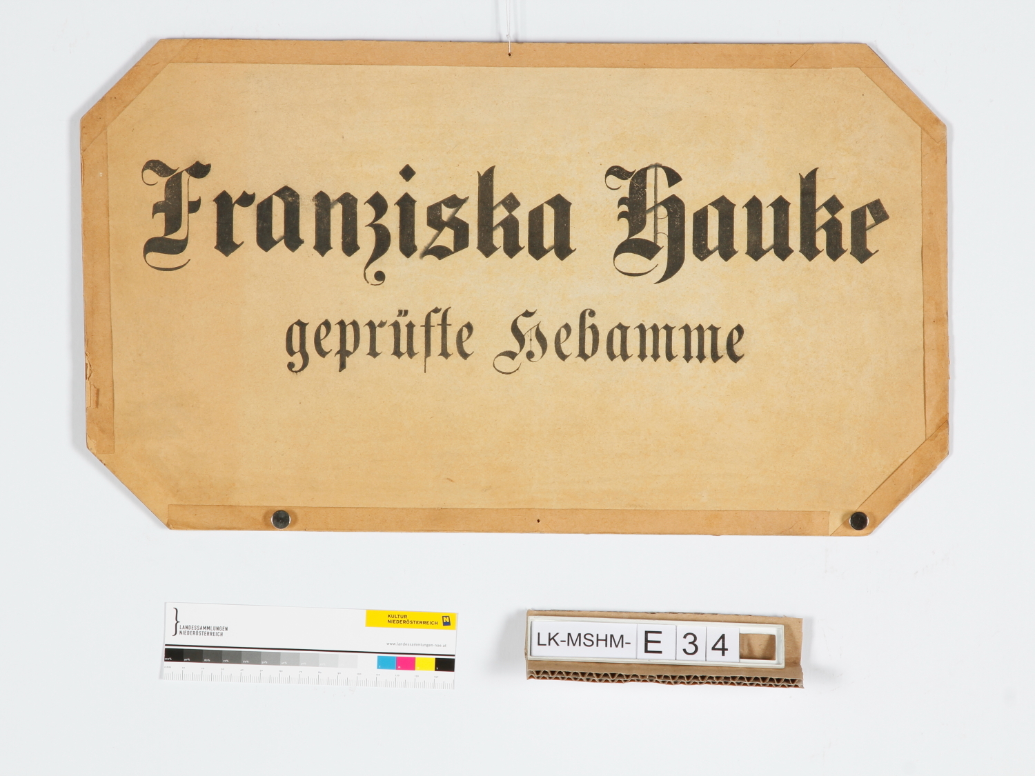Schild bzw. Request der schlesischen Bauernbühne. Aufschrift "Franziska Hauke, geprüfte Hebamme"