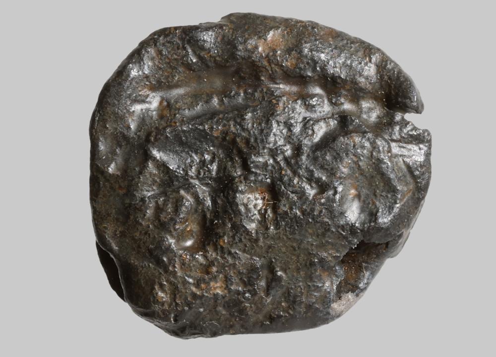 Rundliche Plombe, plattgedrückt, Stempelung nicht mehr erkennbar; waagrechte breite Durchlochung