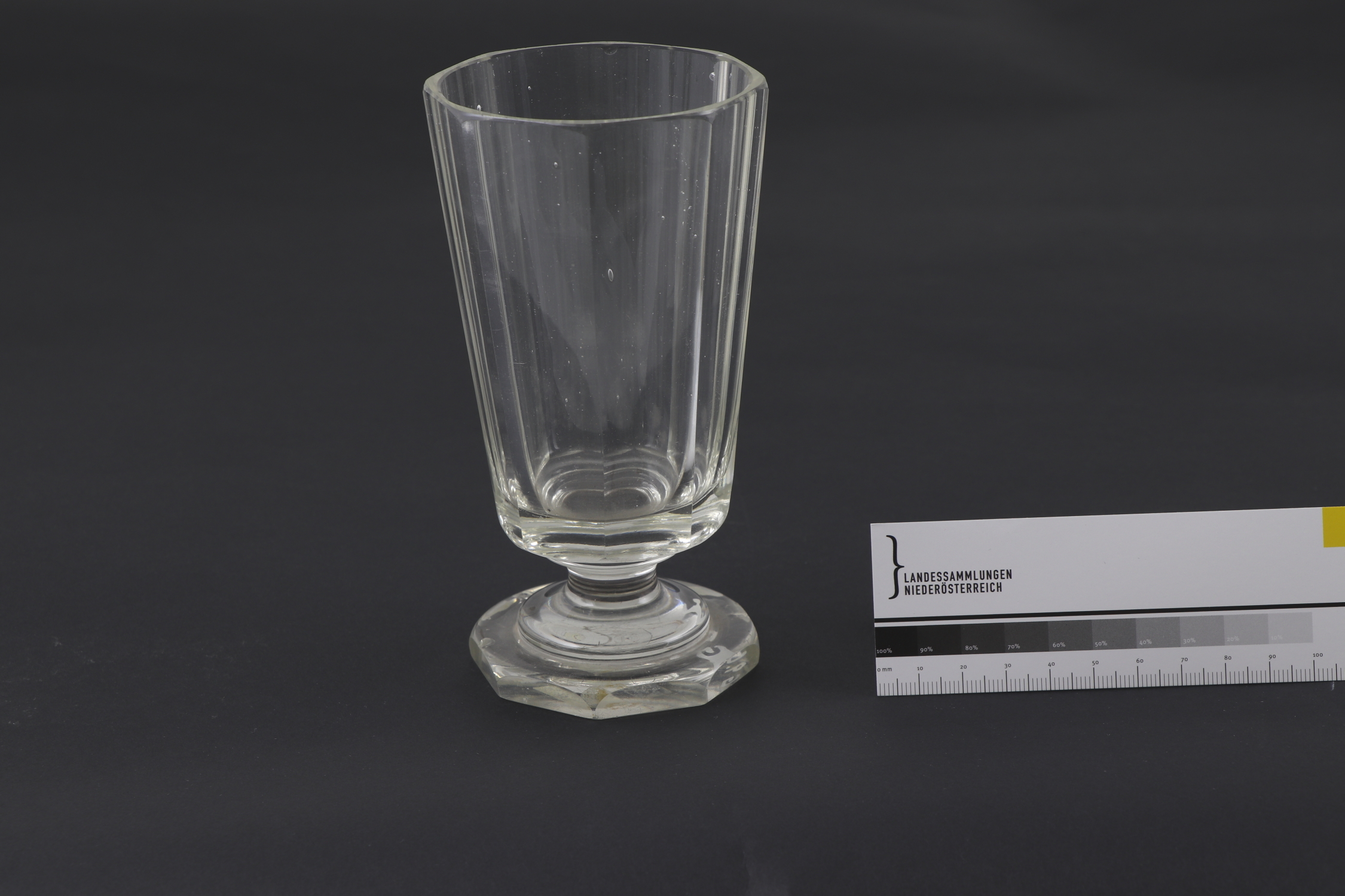 4 runde Kelche mit kurzem Stiel und rundem Standfuß. Glas farblos, transparent. Geschliffenes Dekor. Verwendung vermutlich für Kaffee.