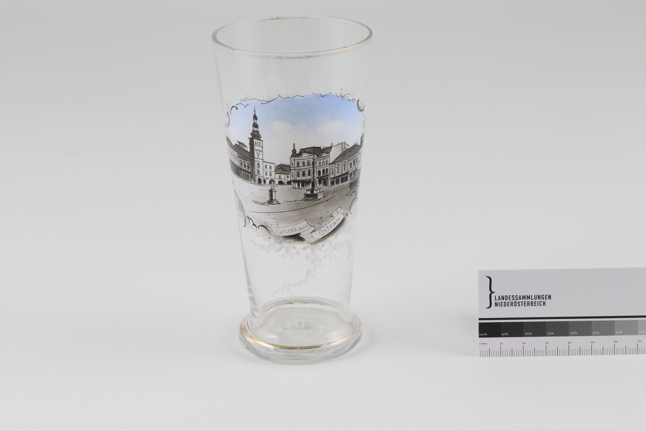 Rundes Trinkglas mit konischer Wandung und ausgestelltem Stand. Motiv (Marktplatz mit dem alten Rathaus und Mariensäule in Mährisch Ostrau/Ostrava) vegetabiler Dekor sowie Aufschrift in Schwarz und Weiß umgedruckt und in Grau und Blau bemalt. Linearer Dekor in Glanzgold gemalt.