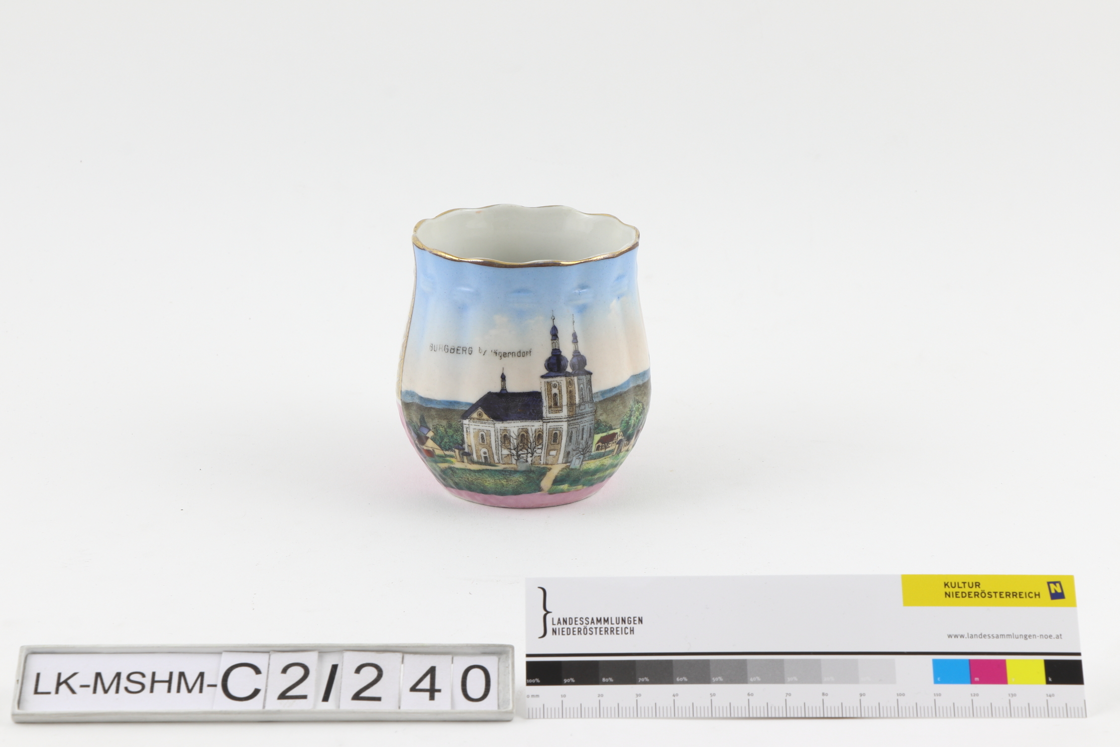 Runde Tasse mit bauchiger Wandung, geraden Faltenzügen und gewelltem Rand. Motiv Wallfahrtskirche der Heiligen Mutter Gottes im Schmerz auf dem Burgberg in Jägerndorf/Krnov, erbaut 1722) in Schwarz, Grau, Blau, Grün, Ocker und Magenta umgedruckt. Linearer Dekor in Glanzgold gemalt.