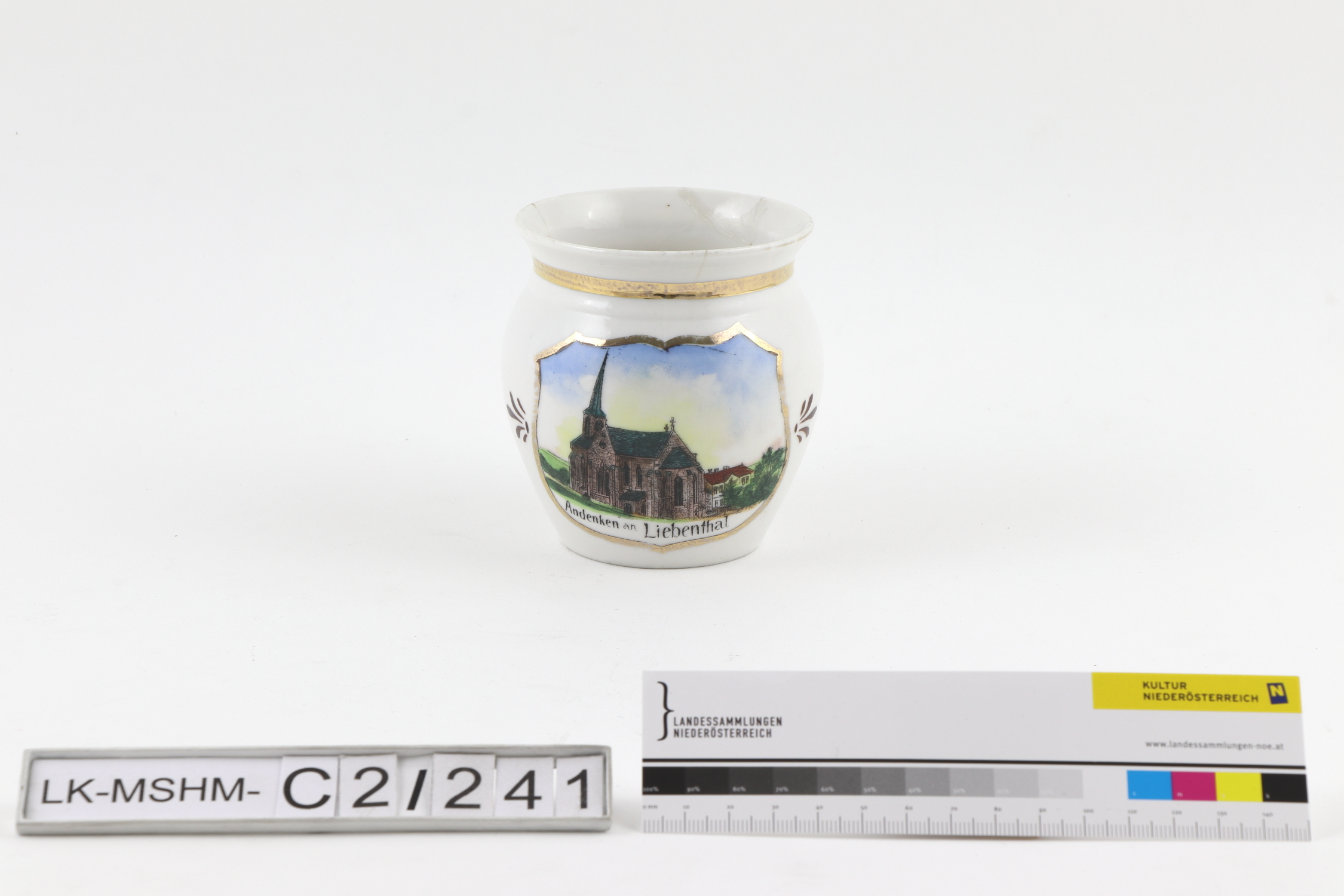Runde Tasse mit bauchiger Wandung. Motiv (unbekannte Kirche) in Schwarz umgedruckt und mit Grau, Blau, Grün, Gelb, Ocker und Rot bemalt. Geometrischer Dekor in Glanzgold gemalt