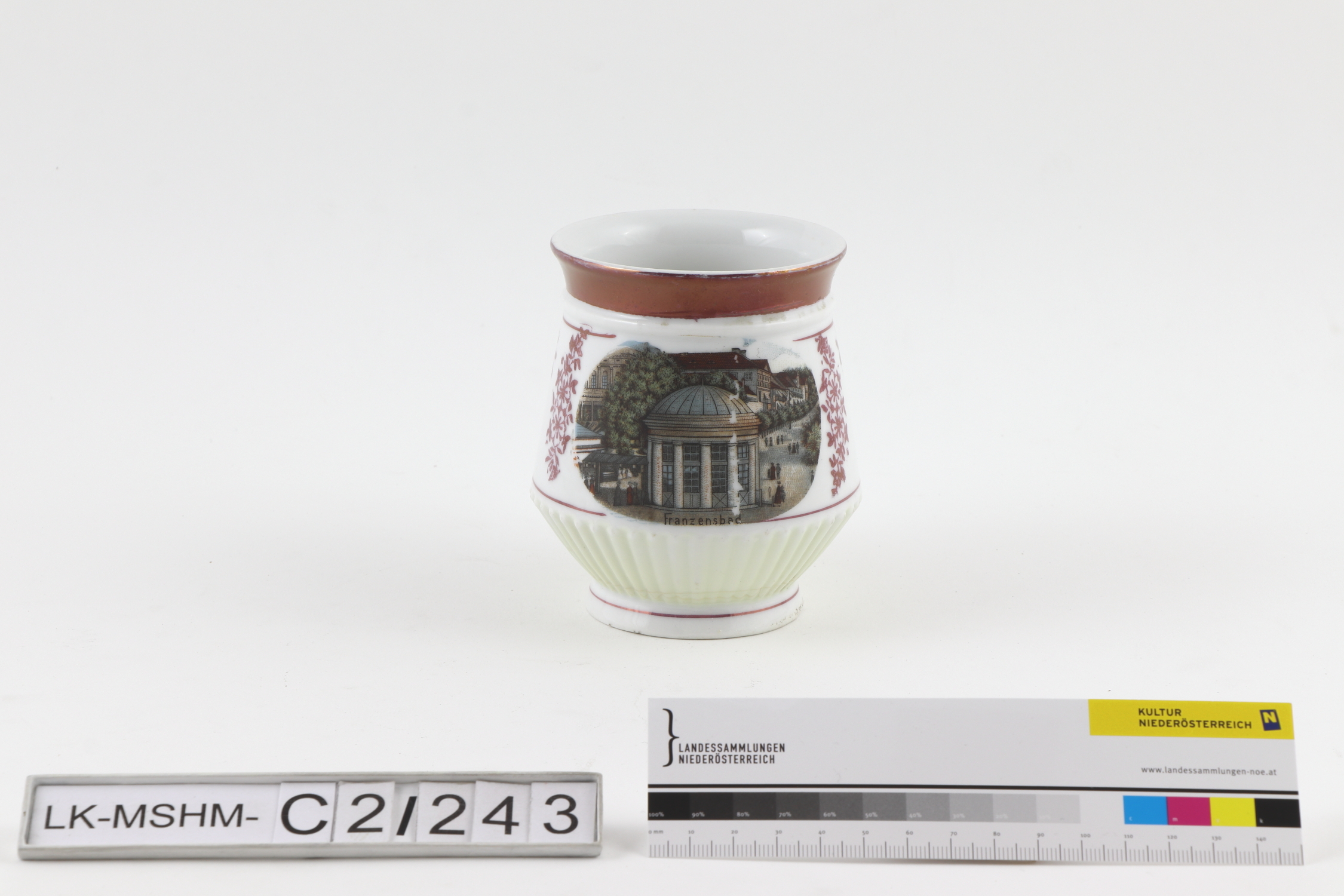 Rund Tasse mit bauchiger Wandung und ausgestelltem Rand. Motiv (Rundtempel der Franzensquelle in Franzensbad/Františkovy Lázně) in Schwarz, Blau, Grün und Magenta umgedruckt, vegetabiler und linearer Dekor in Magenta umgedruckt, linearer Dekor in Glanzgold gemalt.