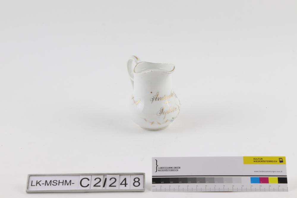 Rundes Kännchen mit bauchiger Wandung, überrandständigem Henkel und geschwungener Schnaupe. Floraler Dekor in Schwarz, Blau und Grün umgedruckt. Vegetabiler Dekor und Aufschrift in Glanzgold gemalt.