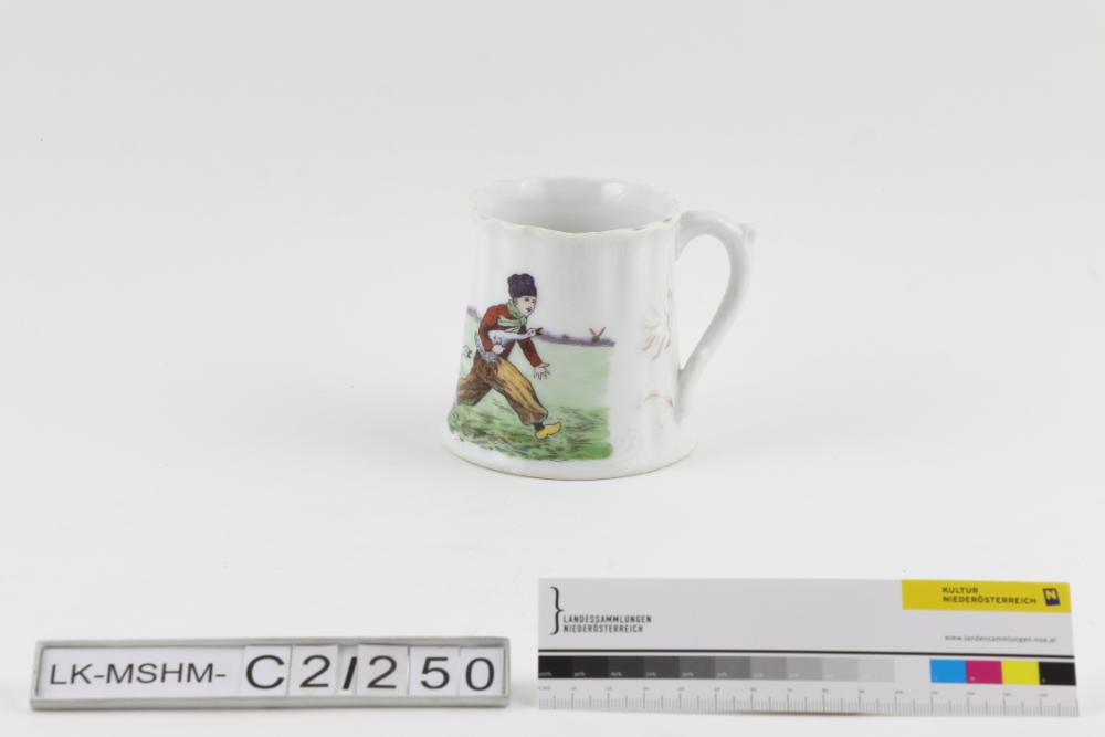 Material/TechnikPorzellan (weißer Scherben), farblos glasiert, auf Glasur im Umdruckverfahren monochrom bedruckt und polychrom bemalt