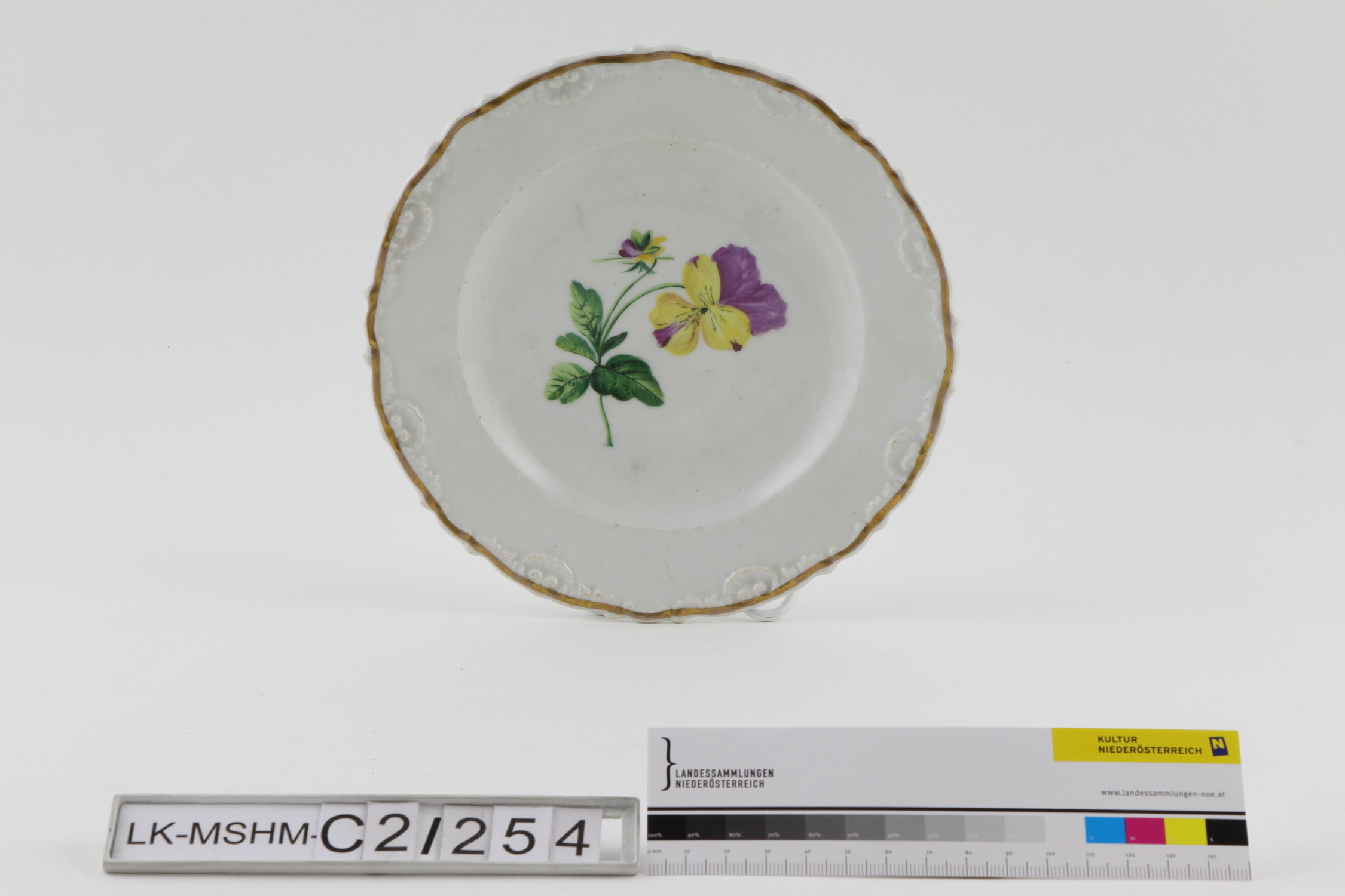 Runder Dessertteller mit erhaben ornamentierter Fahne und gewelltem Rand. Floraler Dekor in Violett, Grün, und Gelb gemalt. Linearer Dekor in Glanzgold gemalt.