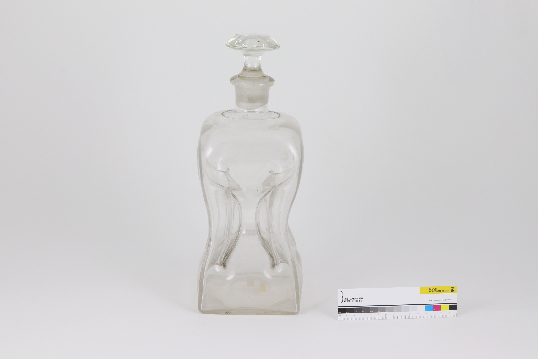 Quadratisch fassonierte Karaffe mit tiefen, geraden Faltenzügen (an der Pfeife modelliert. Schliffstopfen mit runder Handhabe.