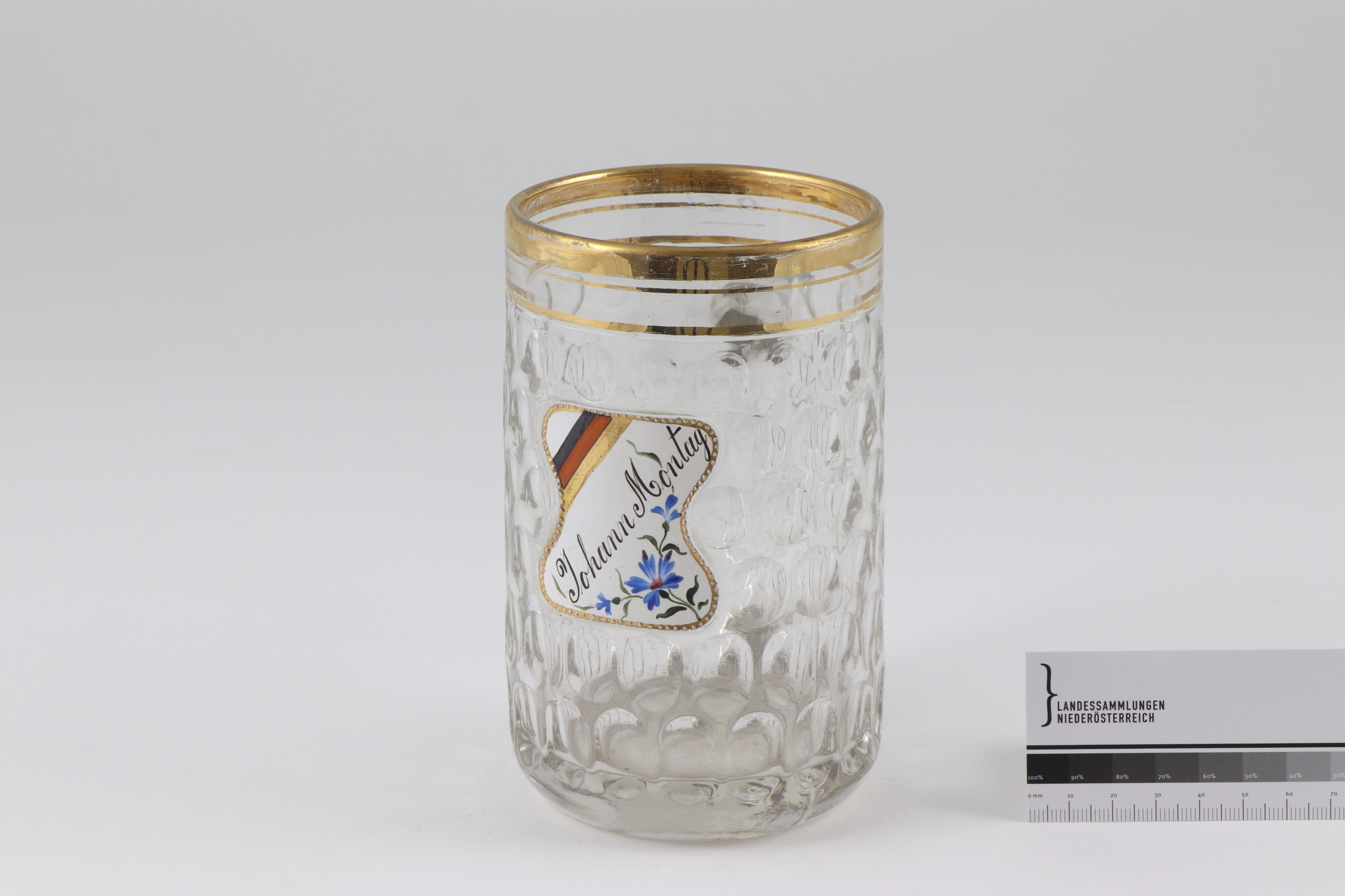Runder Humpen mit gerader Wandung, eingezogenem Stand und erhabenem geometrischen Ornament. Emblem mit Kornblume, Aufschrift sowie linearer Dekor in Schwarz, Blau, Grün, Rot, Weiß sowie Glanzgold gemalt.