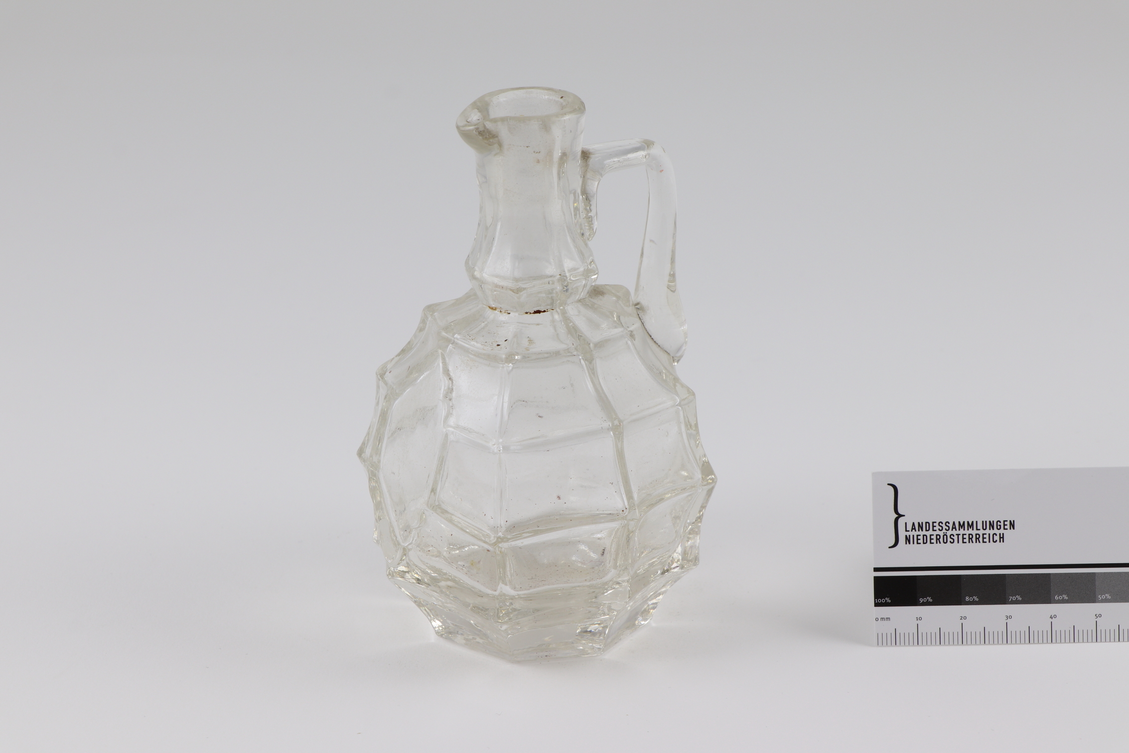 Runde, kugelförmige Karaffe mit kurzem Hals, abgeknicktem Henkel und gerader Schnaupe. Geometrisches, erhabenes Ornament.