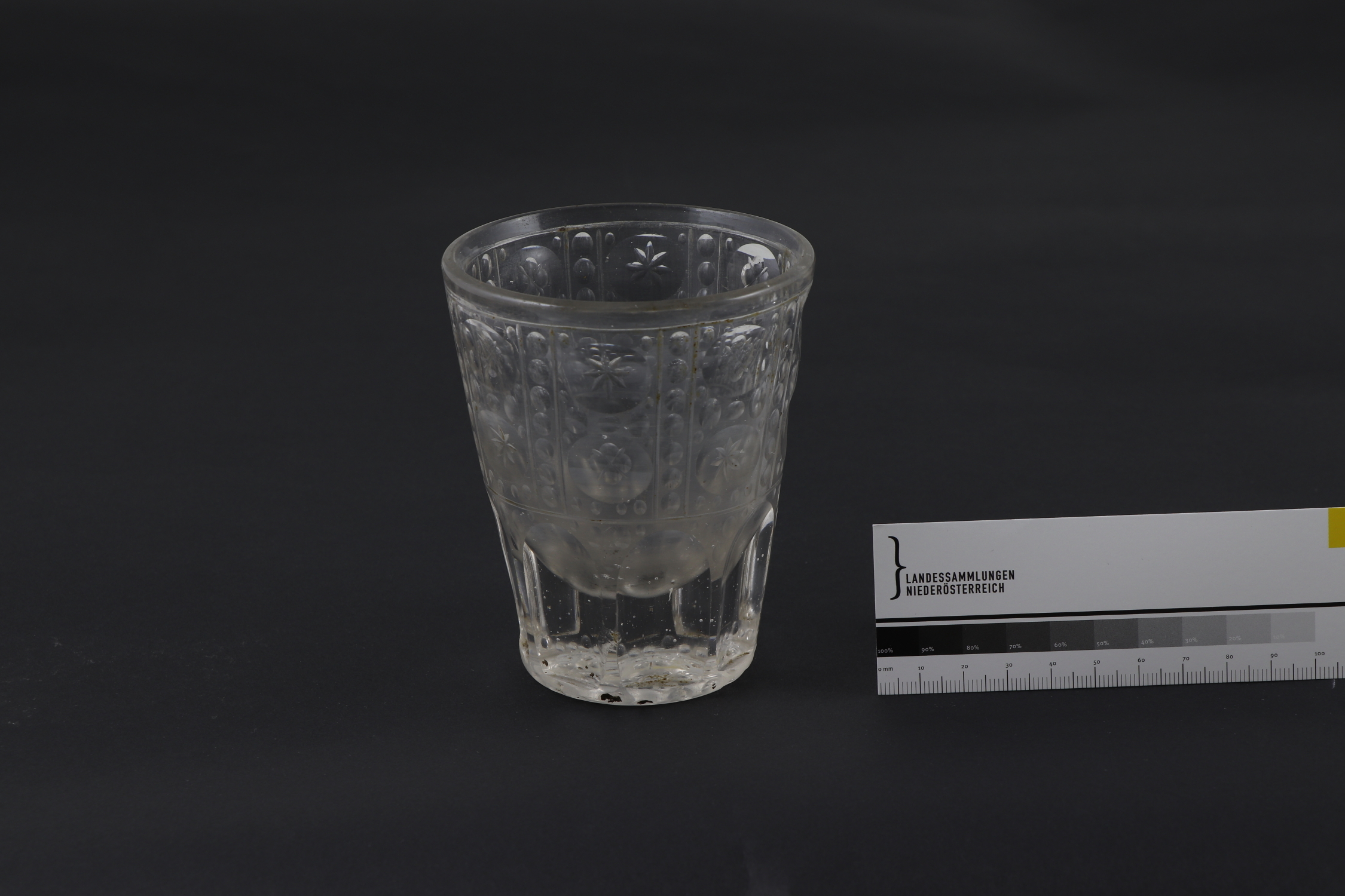 Runder Becher mit konischer Wandung und abgesetzt geschliffenem Rand. Geometrisches Ornament an Standfläche und auf Wandung geschliffen und flammpoliert.