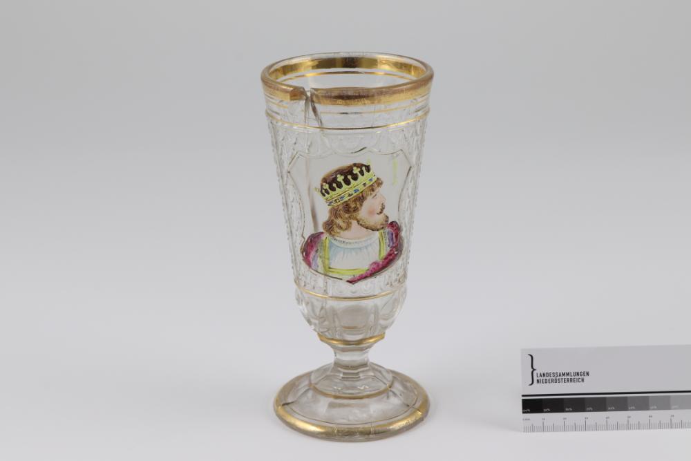 Runder, konischer Kelch mit kurzem Stiel und rundem Standfuß. Glas farblos, transparent. Dekor: erhabenes Portrait mit Krone, Goldränder.