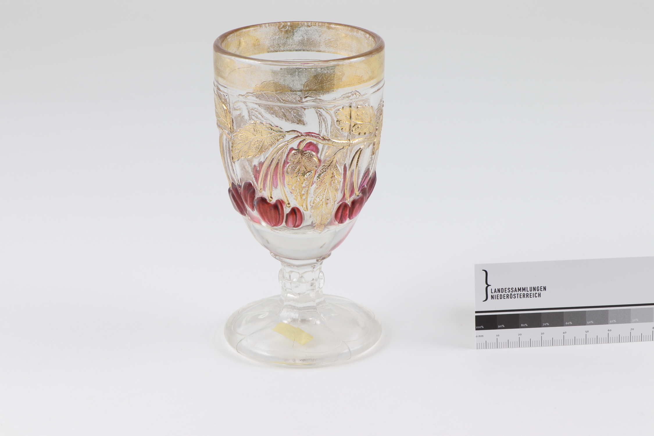 Rundes Teeglas mit gebauchter Wandung und erghabenem, vegetabilen Ornamenten. Kirschen in Rot gemalt, Blattwerk in Glanzgold gemalt. Linearer Dekor in Glanzgold gemalt.