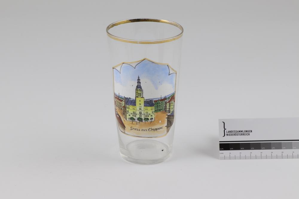 Rundes Trinkglas mit konischer Wandung. Motiv (Rathaus mit dem Schmetterhausturm in Troppau/Opava) sowie Aufschrift in Schwarz und Weiß umgedruckt und Grau, Blau, Grün, Rot und Ocker bemalt. Linearer Dekor in Glanzgold gemalt.