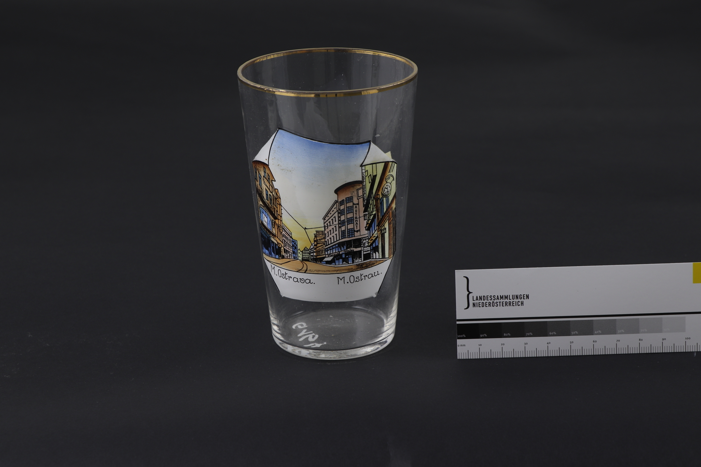Rundes Trinkglas mit konischer Wandung. Motiv (Straßenansicht in Mährisch Ostrau/Ostrava) sowie Aufschrift in Schwarz, Grau, Blau, Grün, Rot, Ocker und Weiß umgedruckt. Linearer Dekor in Glanzgold gemalt.