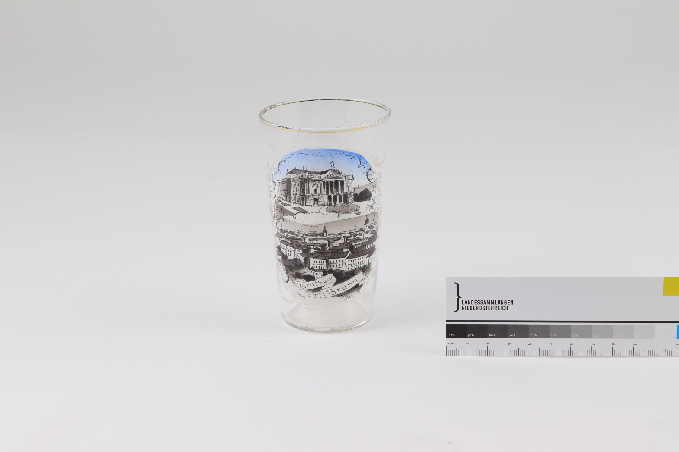 Rundes Trinkglas mit konischer Wandung. Motiv (Stadttheater und Vedute von Brünn/Brno) sowie Aufschrift und vegetabiler Dekor in Schwarz und Weiß umgedruckt und mit Blau bemalt. linearer Dekor in Glanzgold gemalt.