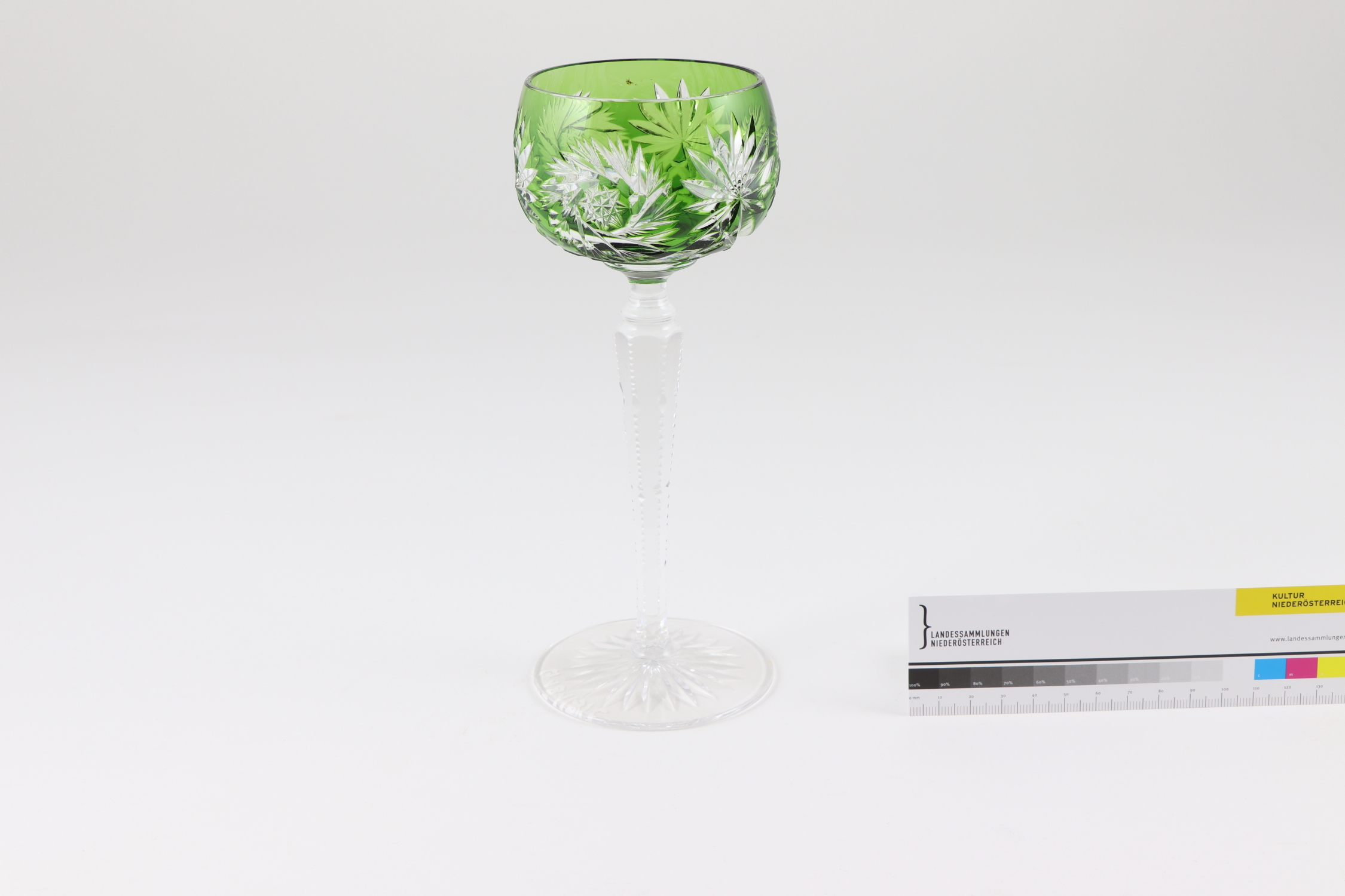 Rundes Weinglas mit sechspassig geschliffenem Stiel. Kuppa in Grün überfangen. Geometrischer Dekor geschliffen und flammpoliert.