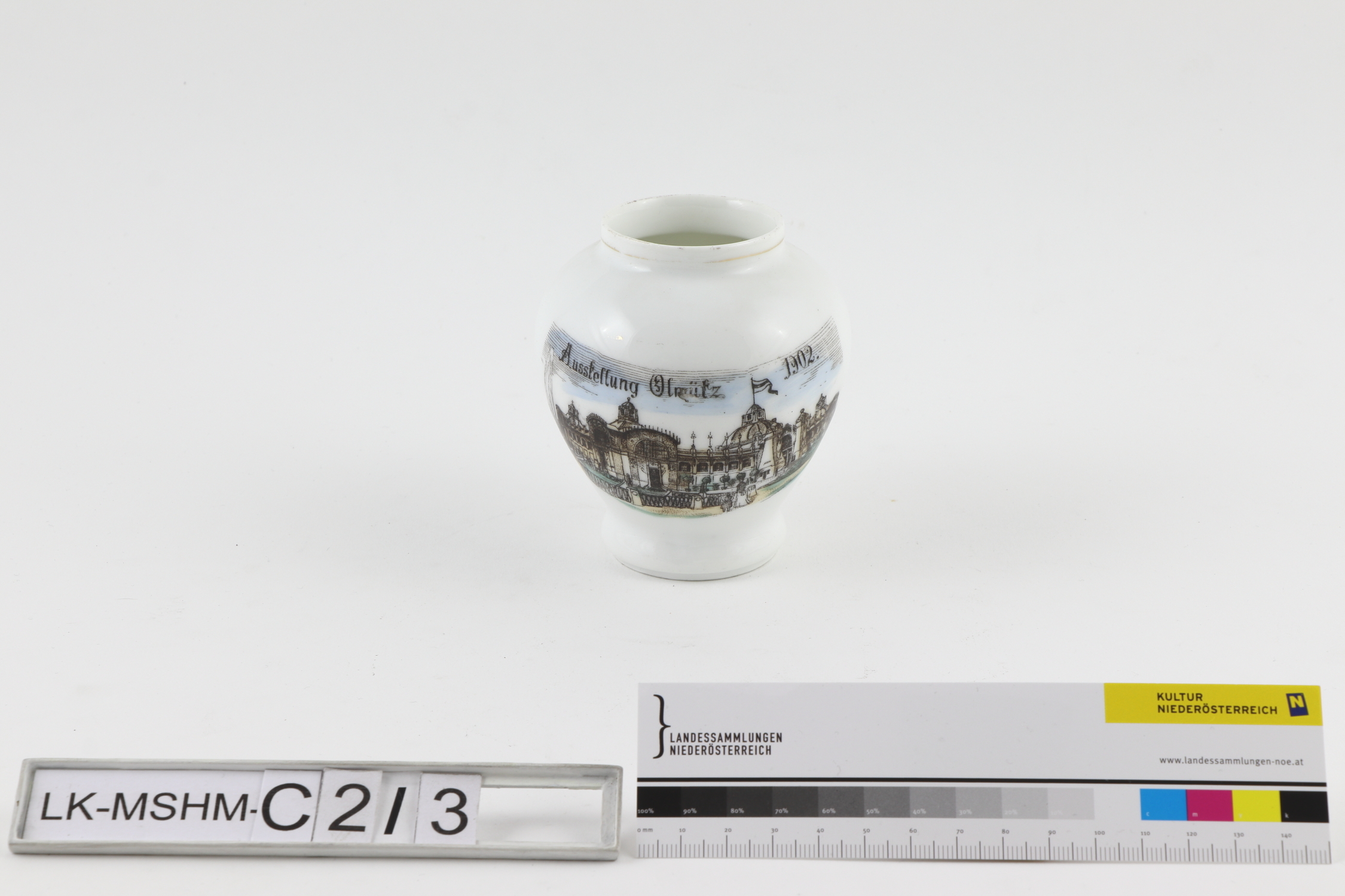 Runde, bauchige Vase. Motiv (Ausstellungspavillons der zweiten Industrie- und Gewerbeausstellung in Olmütz/Olomouc 1902) in Schwarz, Blau, Grün und Ocker umgedruckt. Linearer Dekor in Glanzgold gemalt