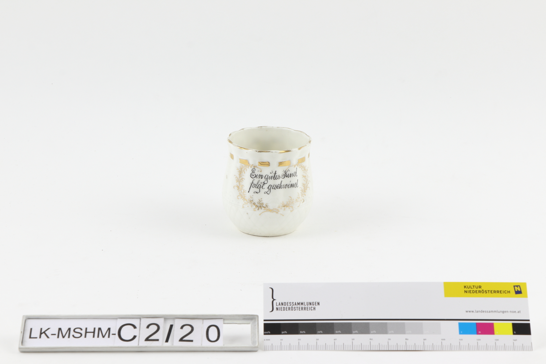 Runde Tasse mit bauchiger bauchiger Wandung, geraden Faltenzügen und unterrandständigem Henkel. Vegetabiler und linearer Dekor in Glanzgold gemalt, Schrift in Schwarz gemalt.