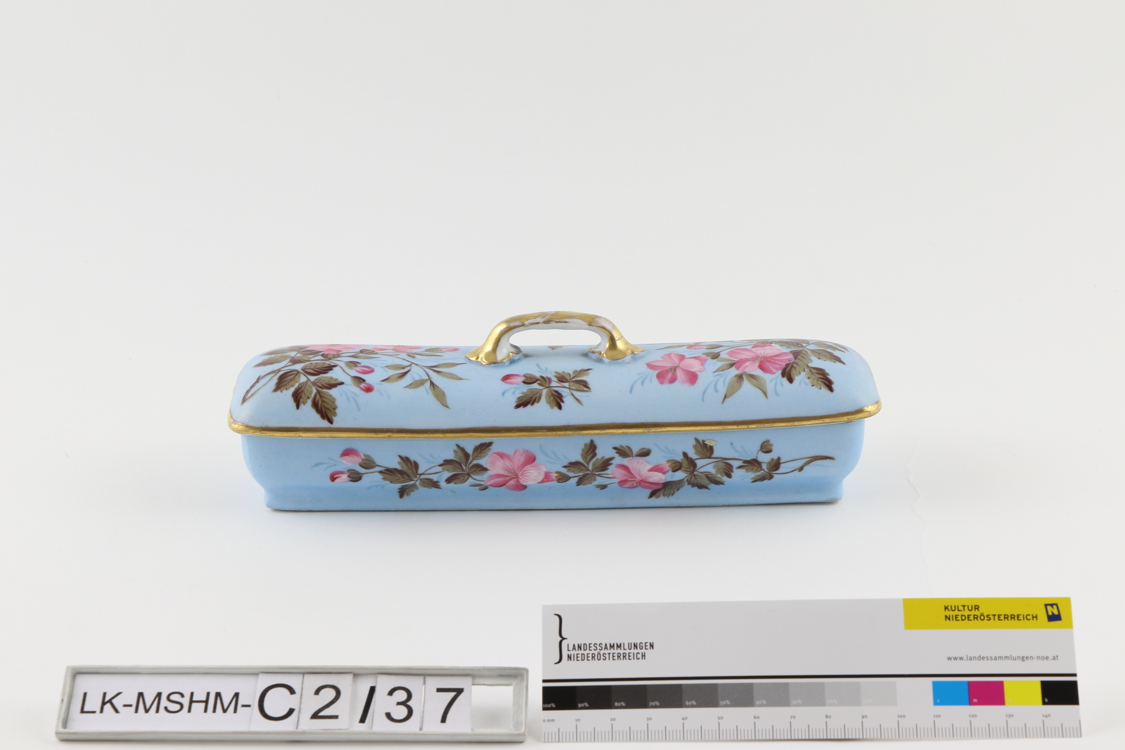 Langgezogene, rechteckige Schale mit gebauchter Wandung, Deckel mit bügelförmiger Handhabe. Floraler Dekor in Grün, Magenta und Ocker gemalt. Linearer Dekor in Glanzgold gemalt.