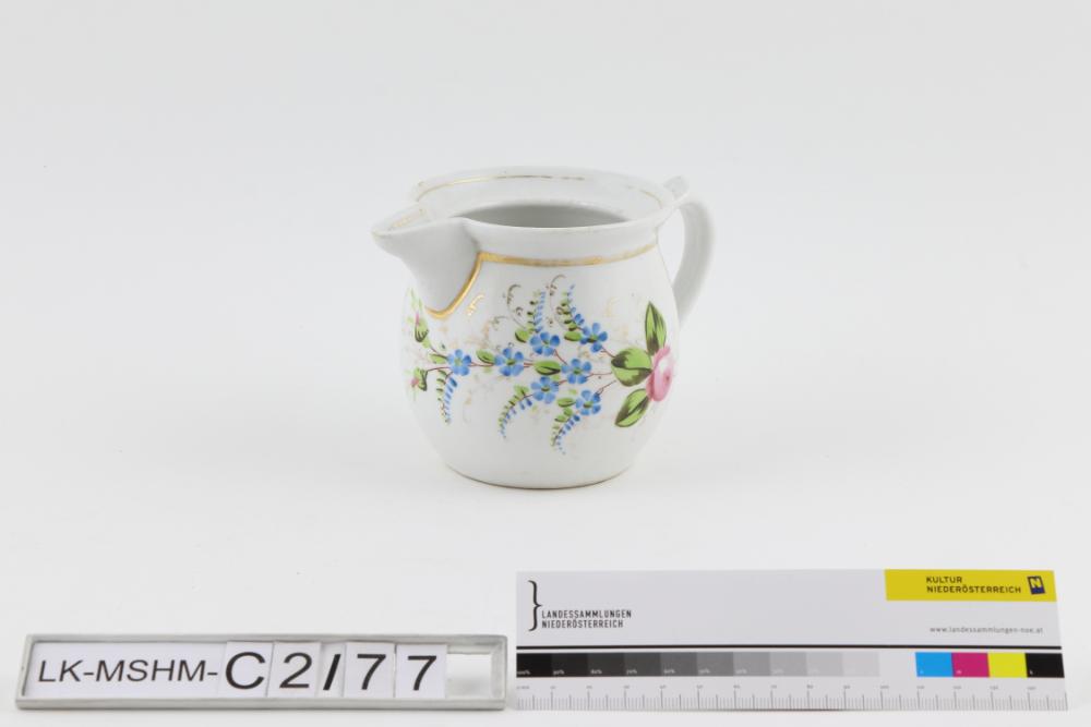 Rundes Sahnekännchen mit gebauchter Wandung, geschwungener Schnaupe und Henkel. Deckel fehlt. Floraler Dekor in Schwarz, Blau, Grün, Magenta und Glanzgold gemalt. Linearer Dekor in Glanzgold gemalt.