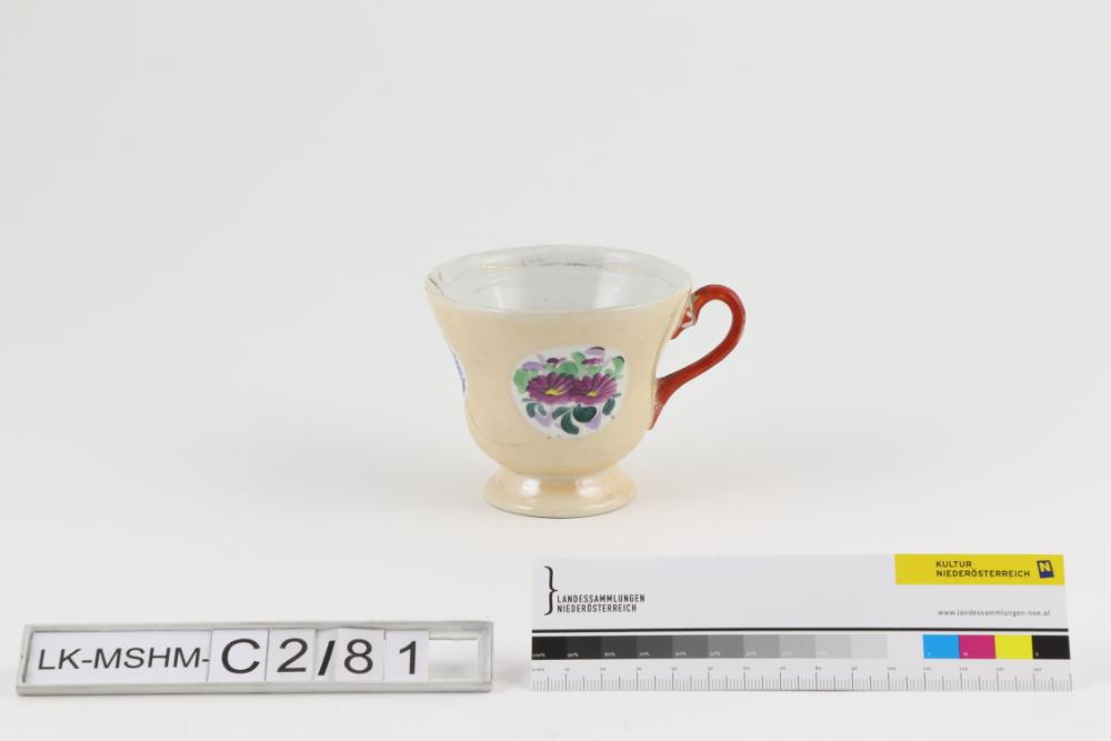 Runde Tasse mit geschwungener Wandung. Floraler Dekor in Medaillons in Blau, Grün und Violett gemalt. Linearer Dekor in Glanzgold gemalt. Henkel monochrom in Rot bemalt.