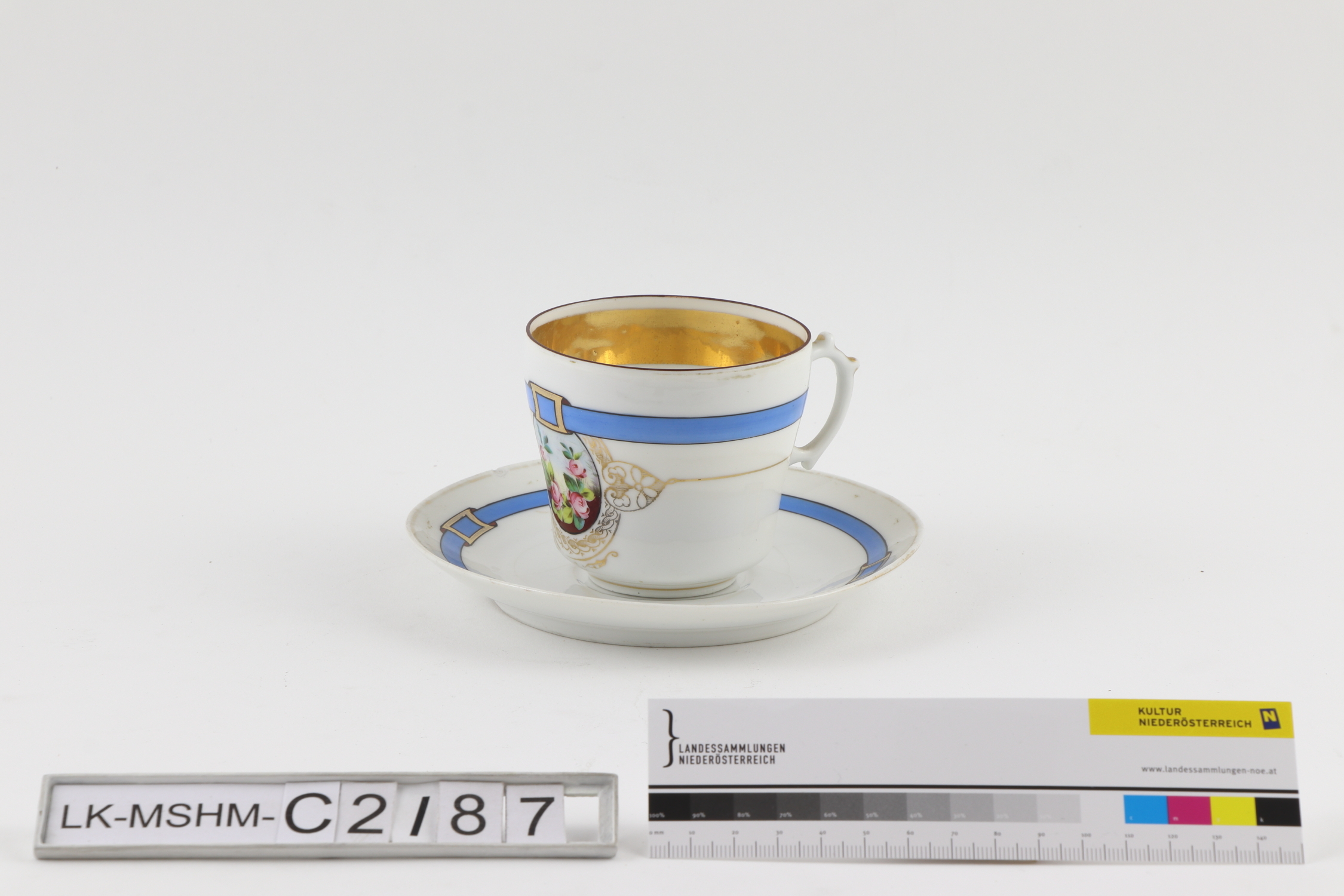 Tasse mit leicht konischer Wandung und zugehöriger Untertasse. Floraler und geometrischer Dekor in Schwarz, Blau, Grün, Magenta und Ocker gemalt. Vegetabiler und linearer Dekor in Glanzgold gemalt.