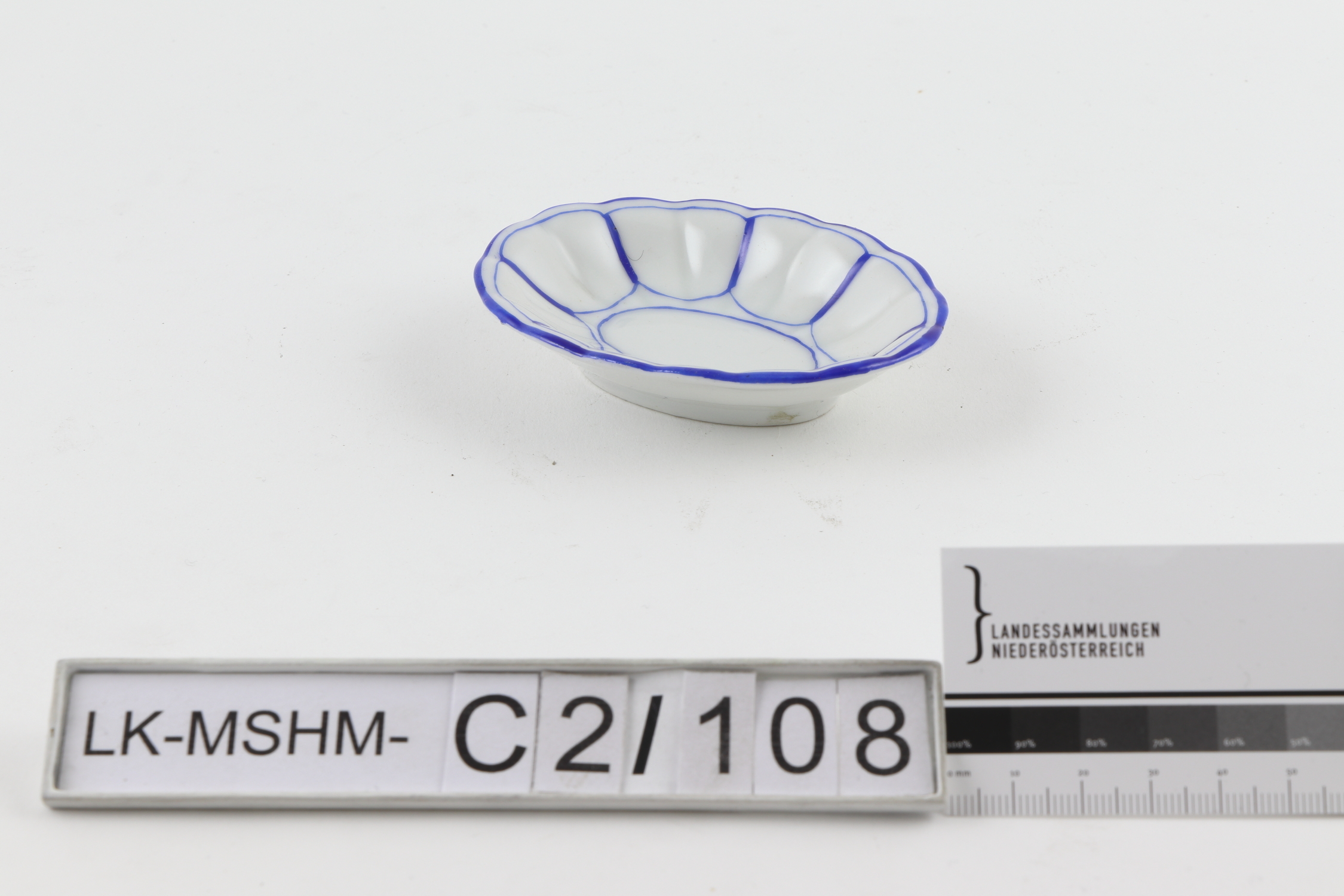 Saucenschüssel ovaler Fassonierung mit geraden Faltenzügen, geometrischer Dekor in Blau gemalt.