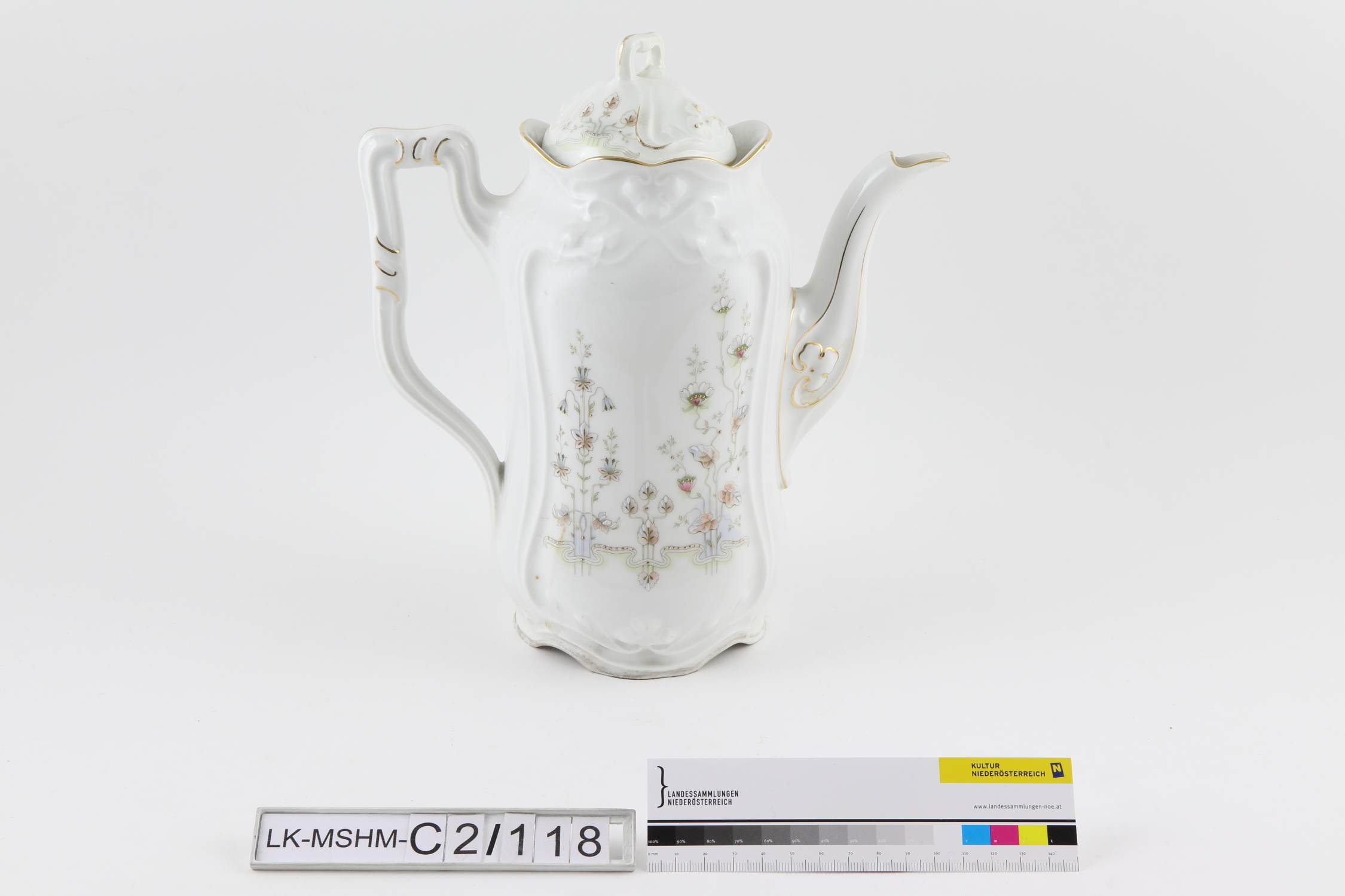Rund fassonierte Kanne mit Jugendstilornament (Kleeblattmotiv) auf gerader Wandung, geschwungener Stand, Rand und Tülle, abgewinkelter Henkel, Deckel mit geschwungener Öse, floraler Dekor in Anthrazit umgedruckt und in Blau, Grün, Magenta und Weiß bemalt, Höhungen in Poliergold, vegetabiler Dekor in Glanzgold gemalt.