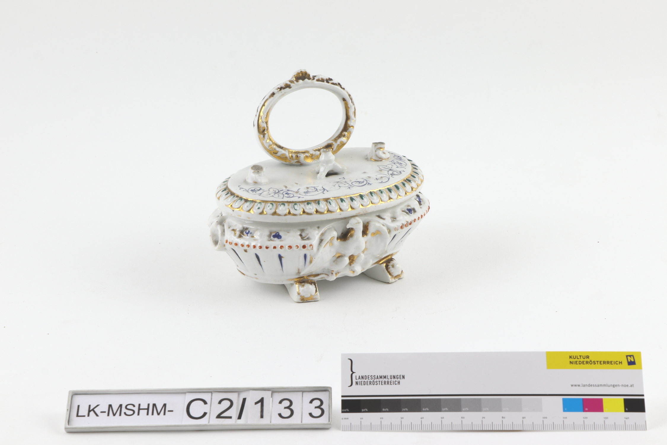 Ovale Dose, bauchig, 2 Standfüsse, Deckel mit ringförmigem Henkel. Glasur innen und außen weiß, blaue Bemalungen und Vergoldungen. Signatur: LG/56.