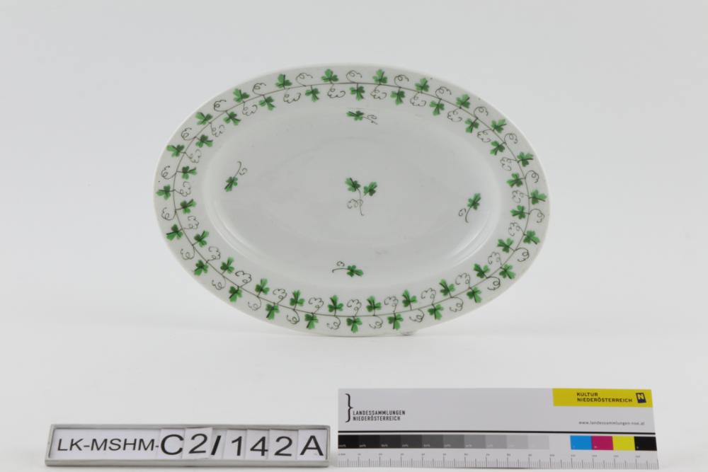 Ovale Vorlegeplatte. Vegetabiler Dekor in Schwarz und Grün gemalt.