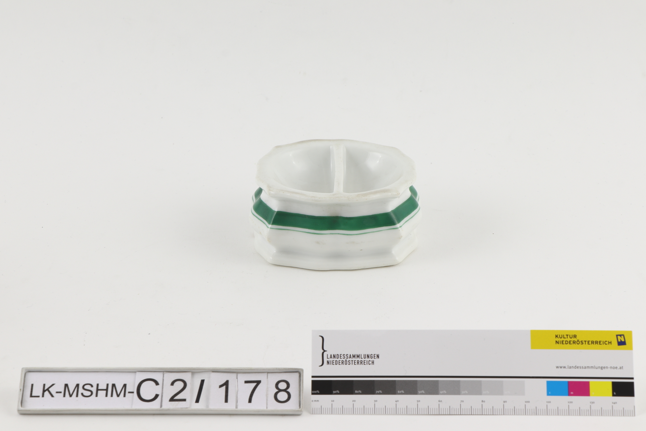 Gewürzschälchen mit Teilung, oval fassoniert, gebaucht, mit geraden Faltenzügen. Linearer Dekor in Grün gemalt.