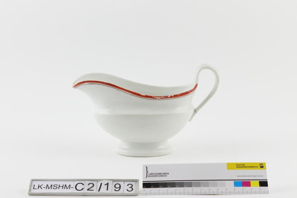 Sauciere, oval fassoniert, ohne Untertasse, mit geschwungener Schnaupe und überrandständigem Henkel. Linearer Dekor in Rot gemalt.