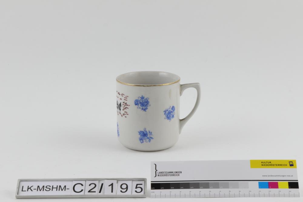 Runde Tasse mit eingezogenem Standund unterrandständigem Henkel. Floraler Dekor in Blau umgedruckt. Aufschrift und geometrischer Dekor in Magenta und in Schwarzlot gemalt. Linearer Dekor in Glanzgold gemalt.