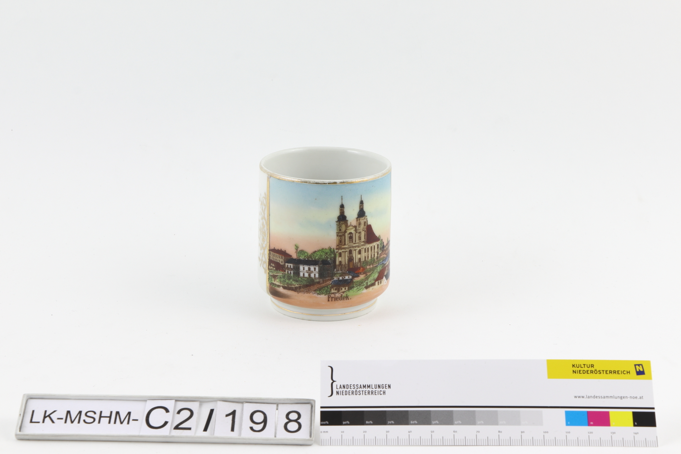 Runde Tasse mit eingezogenem Stand gerader Wandung und unterrandständigem Henkel. Motiv (Wallfahrtsbasilika Mariä Heimsuchung in Friedeck/Frýdek-Místek) in Schwarz, Blau, Grün und Ocker umgedruckt. Linearer Dekor in Glanzgold gemalt.