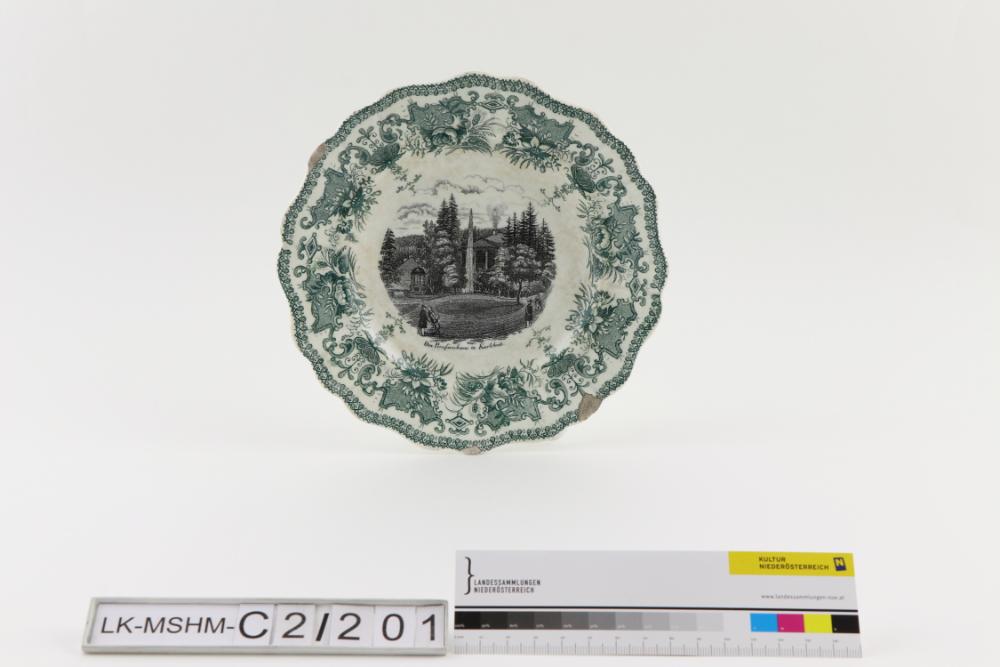 Runder flacher Teller mit gewelltem Rand. Motiv (Gasthaus "Preußenhaus" in Karlsbrunn) in Schwarz umgedruckt, Vegetabil-geometrischer Dekor in Grün umgedruckt.