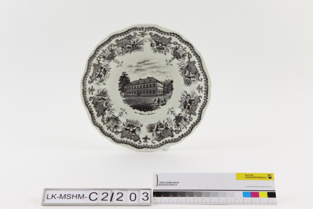 Runder flacher Teller mit gewelltem Rand. Motiv (Gasthaus in Karlsbrunn) und vegetabil-geometrischer Dekor in Schwarz umgedruckt.