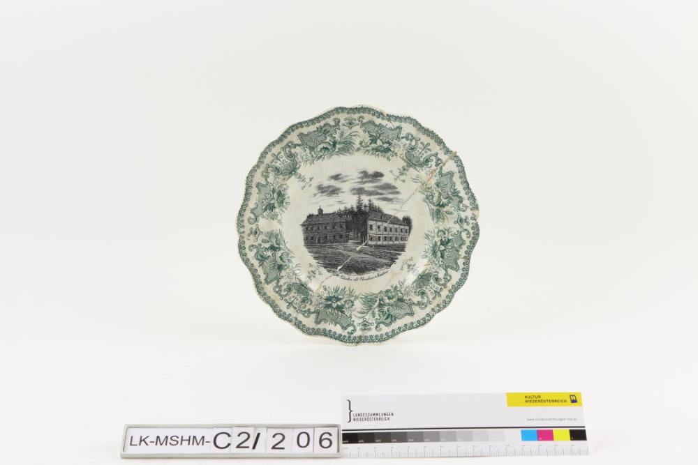 Runder flacher Teller mit gewelltem Rand. Motiv (Glockenhaus und Herrenhaus in Karlsbrunn) in Schwarz umgedruckt, Vegetabil-geometrischer Dekor in Grün umgedruckt.