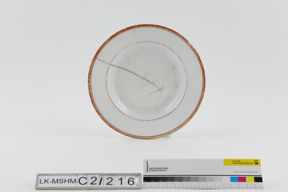 Porzellan (weißer Scherben), farblos glasiert, auf Glasur monochrom bemalt