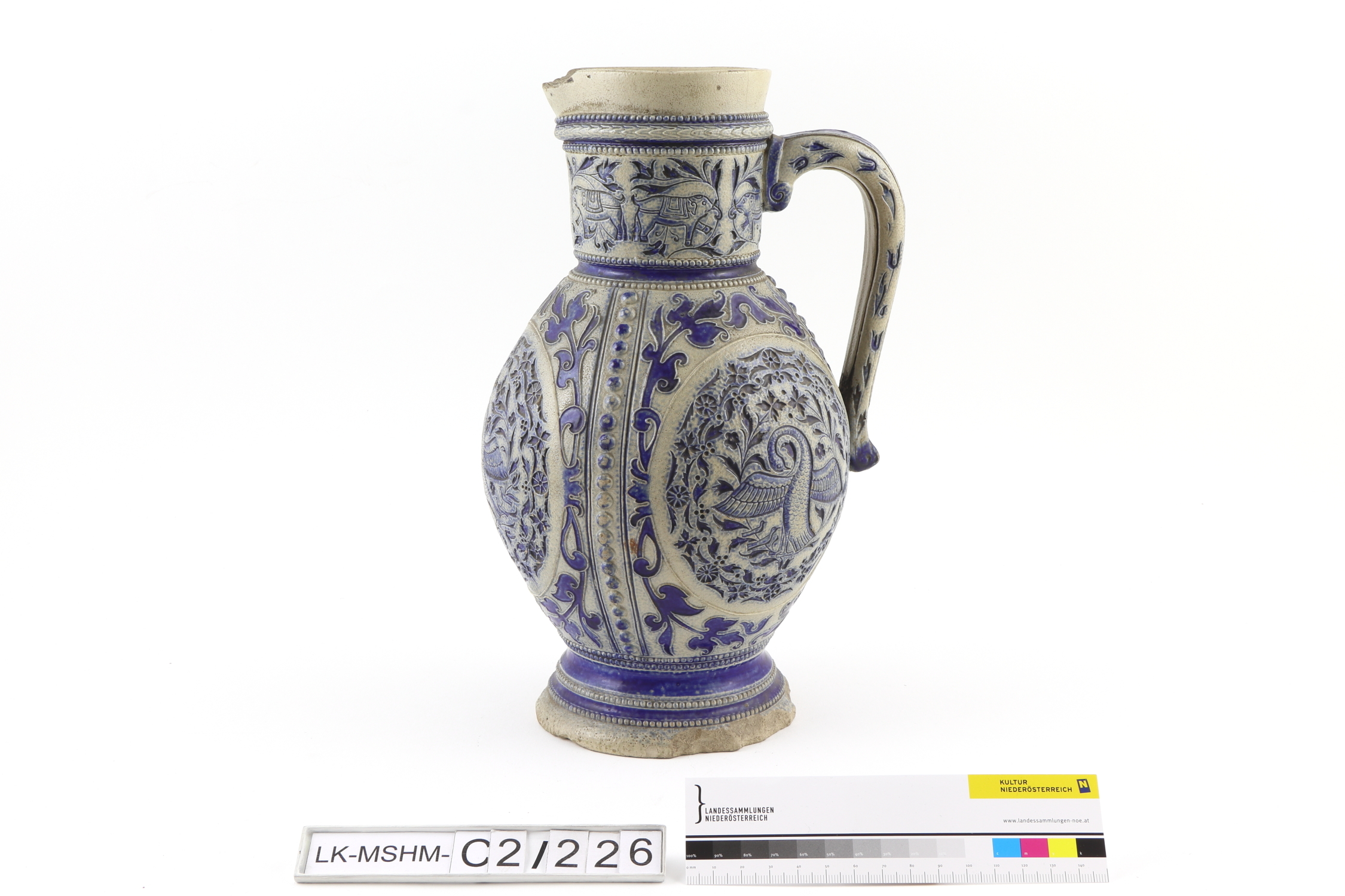 Runde Kanne mit Bauch, geradem Hals, unterrandständigem Henkel und kleiner Schnaupe. Plasische vegetabile und geometrische Ornamentierung, mit blauer Glasur akzentuiert