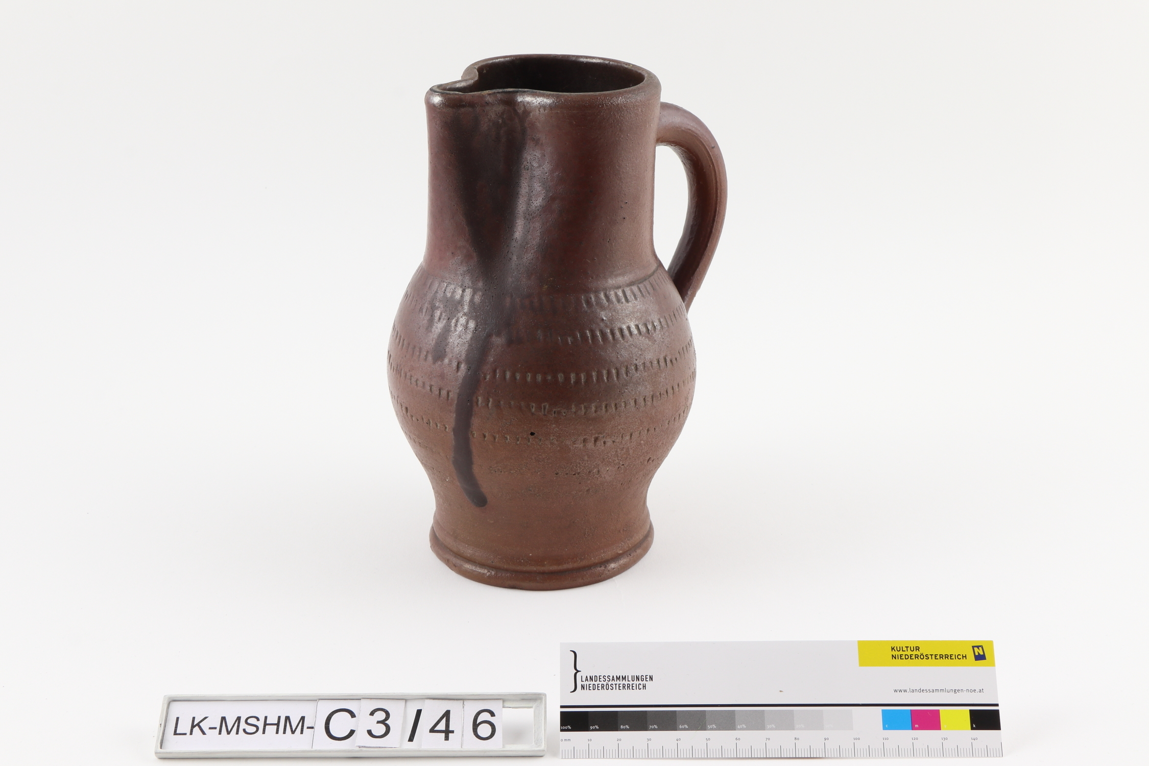 Schnauzenkanne mit 1 unterrandständigen, tangential aufgesetzten Henkel und 1 eingefalteten Ausguss. Glasur außen braun. Bauchige Form mit Zylinderhals und Standring. Im mittleren Bereich um die Außenseite des Kannenbauchs kreisrunder gehackter (eingetiefter) Dekor. Sign. b. Henkel L.