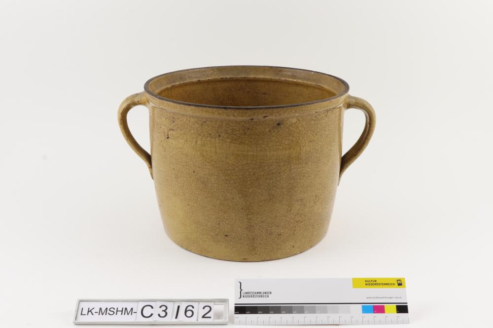 Leicht bauchiger Doppelhenkeltopf mit 2 unterrandständigen Henkeln und ausgestelltem Rand. Ockerfarben glasiert. Sign. 4.