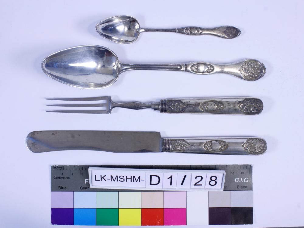 Vierteiliges Besteckset: Suppenlöffel, Gabel, Messer, Teelöffel. Patengeschenk aus Mährisch Trübau.