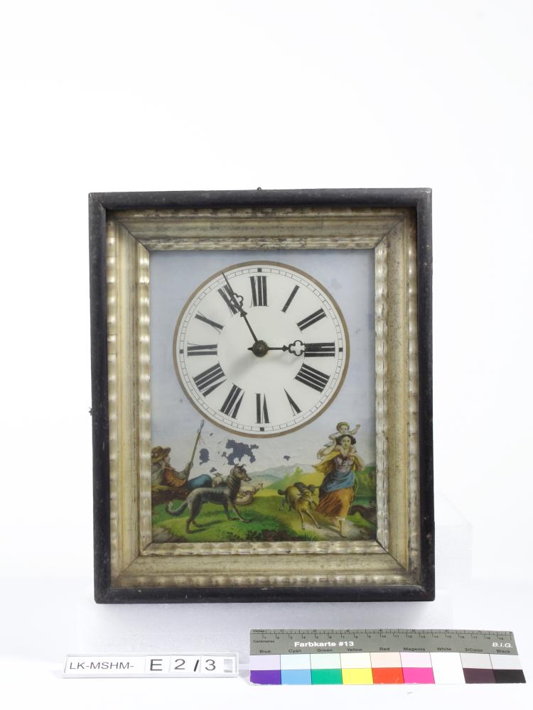 Rahmenuhr mit Schäferidyll, einfaches Schottenwerk mit Kettenzügen und Gewichten, Hakenhemmung mit Pendel, Stundenschlag mit Schlosscheibensystem auf Tonfeder. Zierrahmen Flammleisten mit Blattmetallauflage. Zifferblatt hinter Glas gemalt, römische Ziffern und Schienenminuterie, Zeiger Stahl lackiert.
